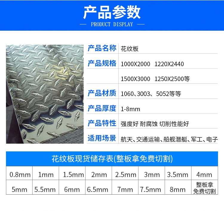 车厢用花纹铝板主要产品有1xxx系 、3xxx系、5xxx系、6xxx系铝合金板材,余航铝业可生产一条筋(又叫指针形或者宝石花纹板)、两条筋、三条筋、五条筋花纹板等,压花铝板广泛应用于建筑、车辆、船舶等防滑用地板、装饰装潢等领域。